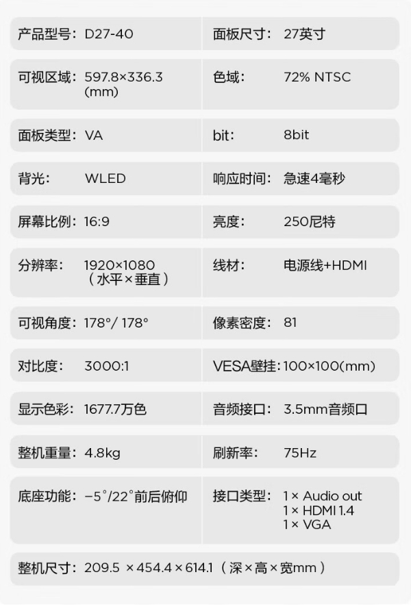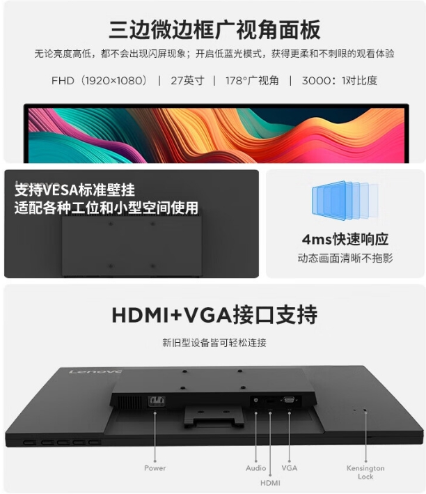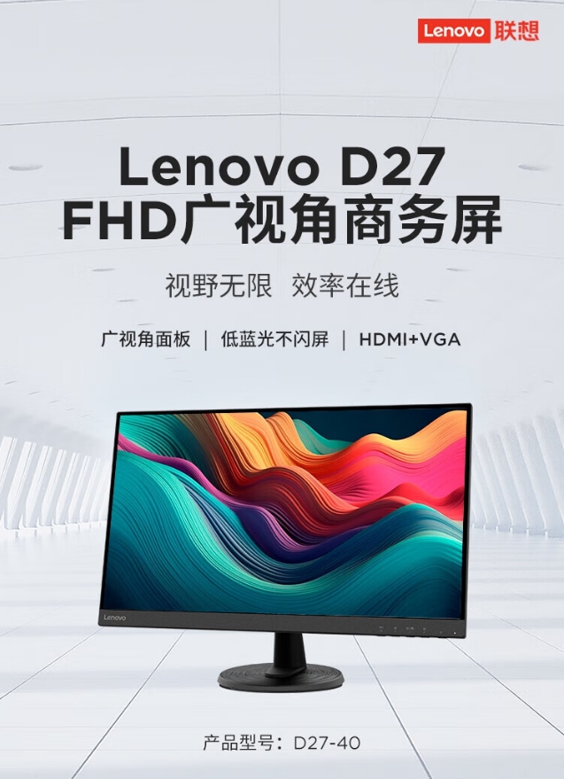 商品名稱:聯(lián)想(lenovo)D27-40 液晶顯示器 微邊框廣視角 低藍(lán)光不閃屏 可壁掛高清屏顯示器