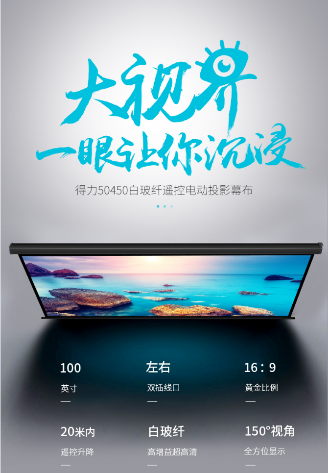 商品名稱:得力(deli)幕布100英寸 16:9 白玻纖遙控電動(dòng)投影幕布投影布(標(biāo)配遙控器) 家用投影儀商務(wù)辦公幕布50450