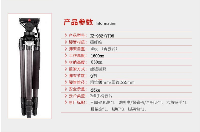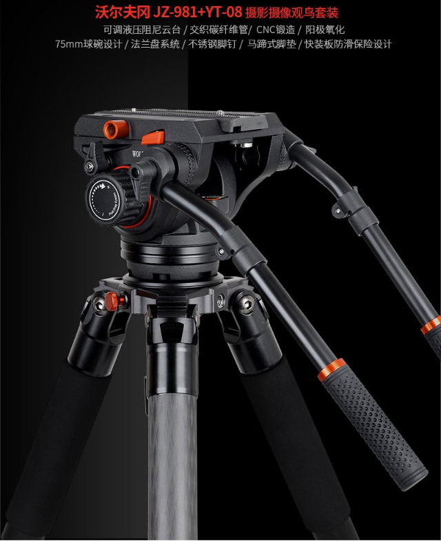 商品名稱:沃爾夫岡(WOLFGANG)JZ-982+YT08 碳纖維三腳架雙手柄液壓阻尼云臺碳纖維套裝3節(jié) 承重25kg 沃爾夫岡三腳架JZ-982
