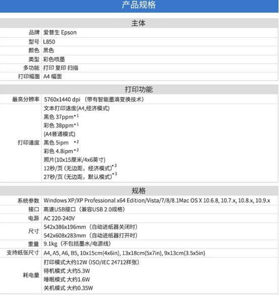 商品名稱:愛普生(EPSON) 墨倉式 多功能打印機一體機噴墨彩色照片連供6色 (復(fù)印掃描打印)愛普生L850