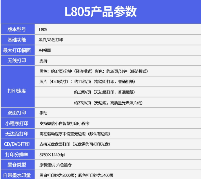 愛普生(EPSON)墨倉式彩色噴墨打印機商用辦公原裝連供照片打印機A4幅 愛普生 L805